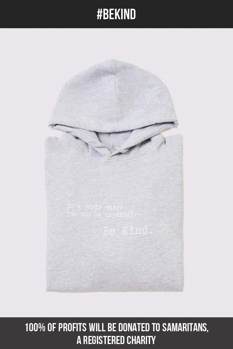 'IN A WORLD WHERE YOU CAN BE ANYTHING, BE KIND'. 100% of profits from the sale of this hoodie will go to the Samaritans Charity.For more information on the amazing work they do, or if you are looking for any support, please click https://www.samaritans.org or call them directly on 116 123.