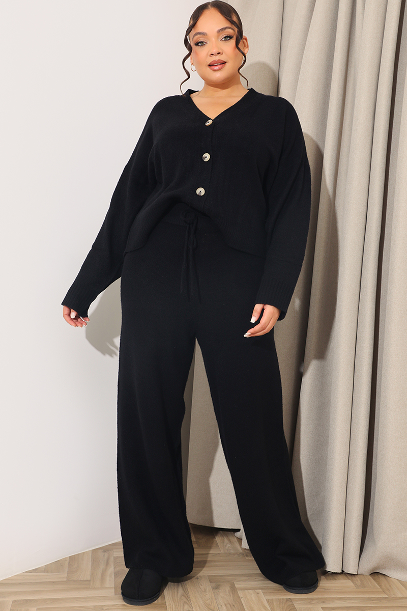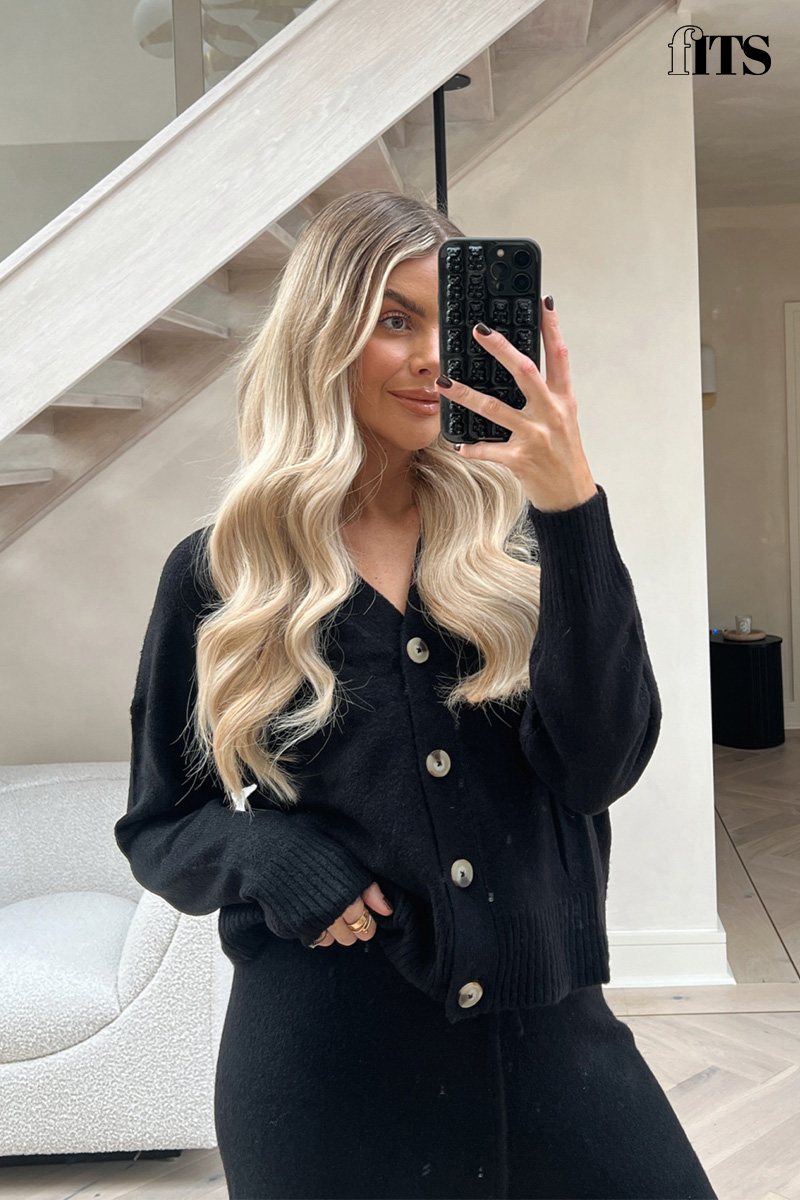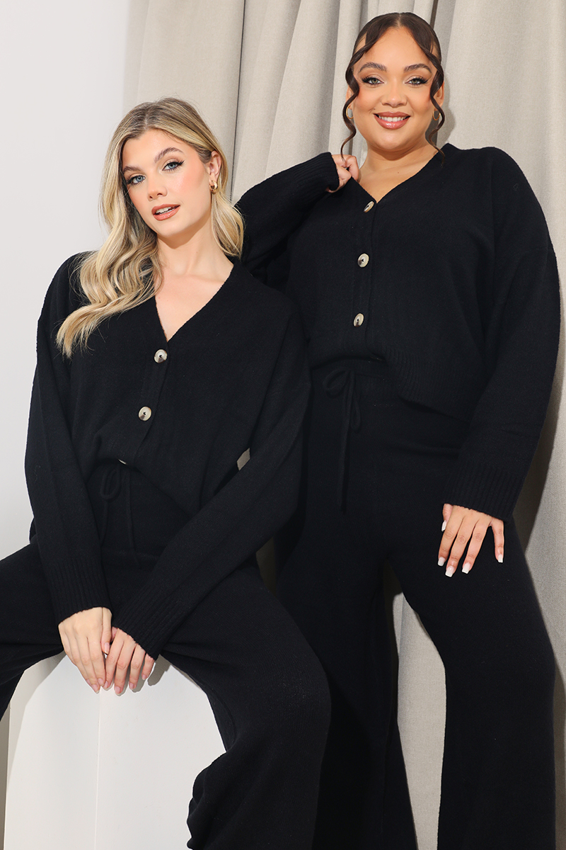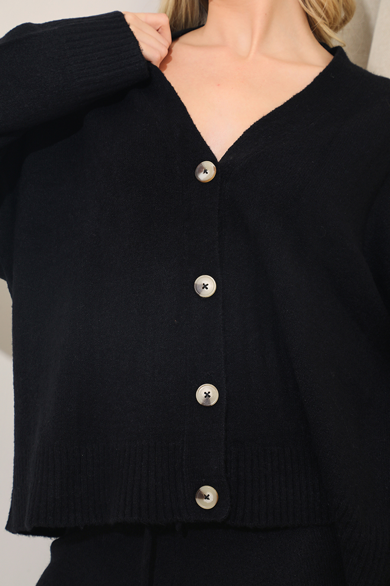 This cardigan is a must have in your new season wardrobe. In a black knitted material and button through style, pair with the matching trousers for a combination we are obsessed with.